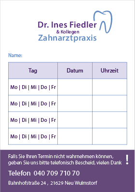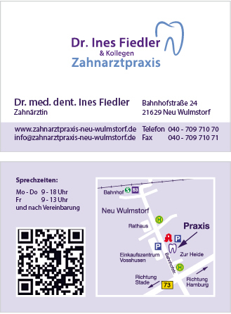 Die Visitenkarten in hellem Violett haben auf der Rückseite für Patienten hilfreiche Informationen über die Sprechzeiten und Lage der Praxis.